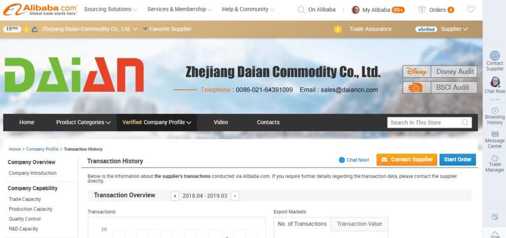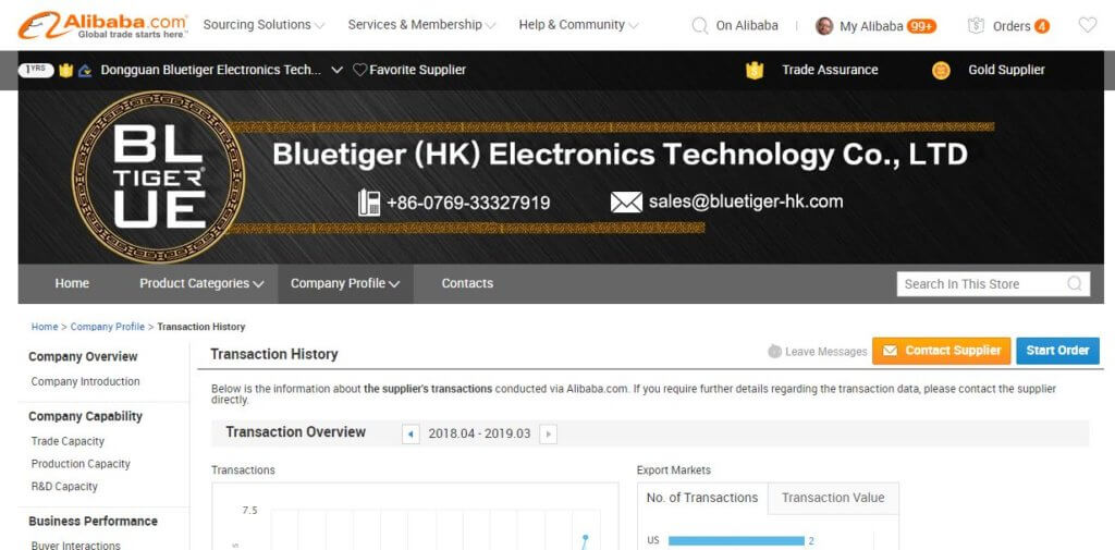 It’s hard to tell exactly what’s going on with Bluetiger’s data. It’s clear that the company once had the capacity to fulfill orders on its own (or, at the very least, were selling wholesale goods). However, their recent transactions aren’t recorded in the Supplier Database, which means they were probably shipped by another company. If it is a trading company, the ‘gold supplier’ and ‘trade assurance’ status on Alibaba is misleading. Having those badges makes it easy for buyers to mistake them for an actual manufacturer.