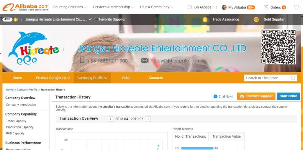 Alibaba has Jiangsu Hicreate Entertainment Co., Ltd. processing 74 transactions, worth $220,000+, over the past six months. That’s $2,972 per transaction. In addition, Alibaba states that US buyers were responsible for 46 of those sales.