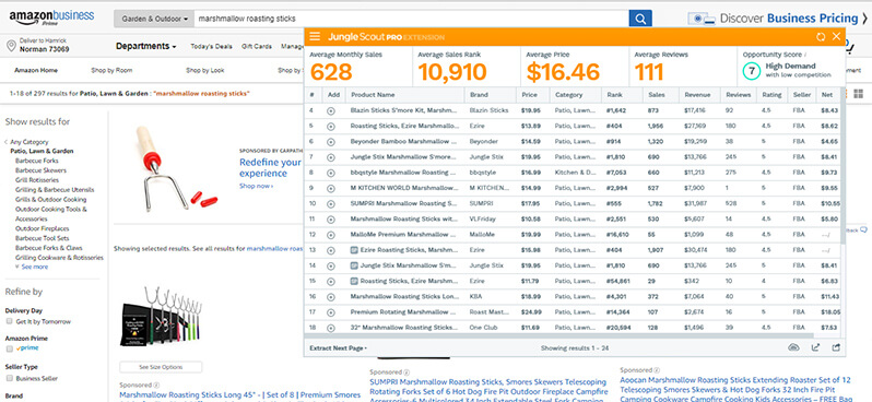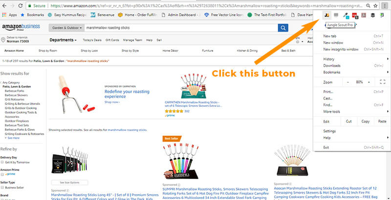 Going back to our SERP for “marshmallow roasting sticks”, this time, instead of spending half a day checking out each individual product page and guestimating the sales totals for each of those products, I’m just going to click this little button here: