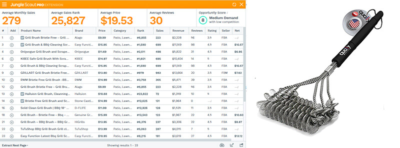 My only trepidation is that ads might end up being costly. Keyword Scout‘s showing ad costs for $1-$2 for most of the key phrases. Still, the term “grill brush” comes up with 1,593 different keywords for us to use. Using the 2.5 Rule, there’s 60+ exact match keywords that cost less than $0.62 and over 250 for broad match. I think we could get ACoS under 25%. That leaves us with about $8 per unit in profit, for $2,208 per month.