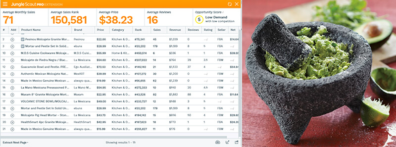 If we price it at $39.95, FBA is going to suck up about $13.50 in fees. And then we’re going to lose another $10 to costs. But that still gives us $16.50 to work with. Using the 2.5 rule, our ACoS target is about $10 and CPC target is $1.00. And that’s also awesome. Looking at Keyword Scout, top keywords are CHEAP… $0.50 for “molcajete” and “mortar and pestle” is $0.90 (that’s a 30,500 monthly search term). Get your conversions up to 10%, and you could see $11.50 in profit per sale. That’s $816.50 in profit per month. Not super great, but still not bad, especially considering the margin.