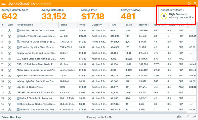 Another benefit of using Keyword Scout and the 2.5 Rule is knowing whether or not a product is too competitive. You may have noticed from our list of keywords under 2.5% of our target sales price, those keywords have relatively low search volumes. This is probably a signal that garlic presses are far too competitive on Amazon. The Chrome Extension confirms this giving it an Opportunity Score of 4 “High Demand with High Competition.”