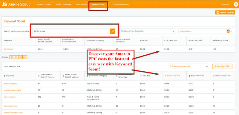 The easiest way to predict Amazon PPC Costs is through Jungle Scout’s Keyword Scout tool. Keyword Scout actually gives you real live Amazon PPC Costs taken directly from Amazon.