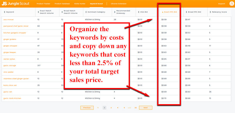Now that you’ve used Keyword Scout to perform Amazon PPC Costs research, you’ll want to select the keywords that will not only get your product seen by more shoppers, but also keep your ACoS below 25%. IE less than 2.5% per click.