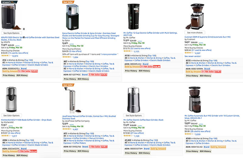 Going back to our coffee grinder example, it’s obvious why the product with the top Amazon product ranking is where it is. First, its BSR is an amazin #14 within the entire Kitchen & Dining category. Already, that means their product gets a ton of sales. Plus, they have at least 3-10x more reviews than any other product found on the first page. And notice how they have the “Amazon’s choice” badge.
