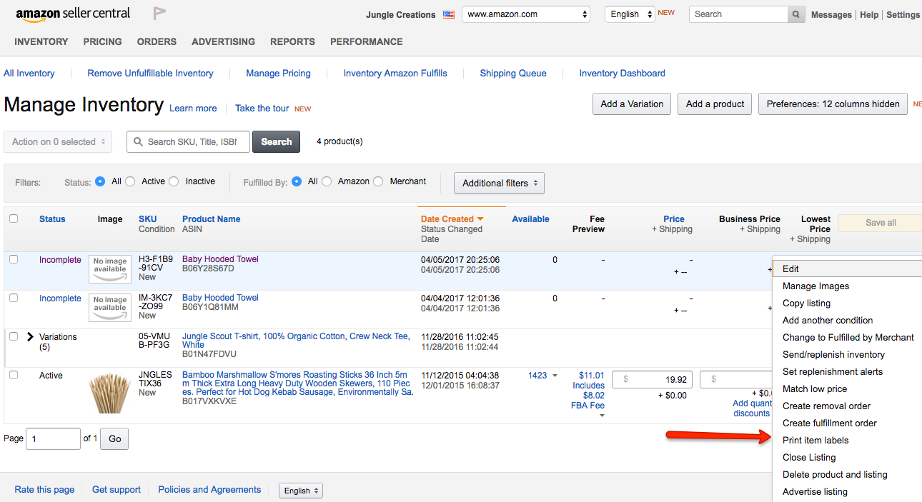 6. Now that your product is created, you can access your FNSKU. From the “Edit” dropdown on the right, select “Print Item Labels”: