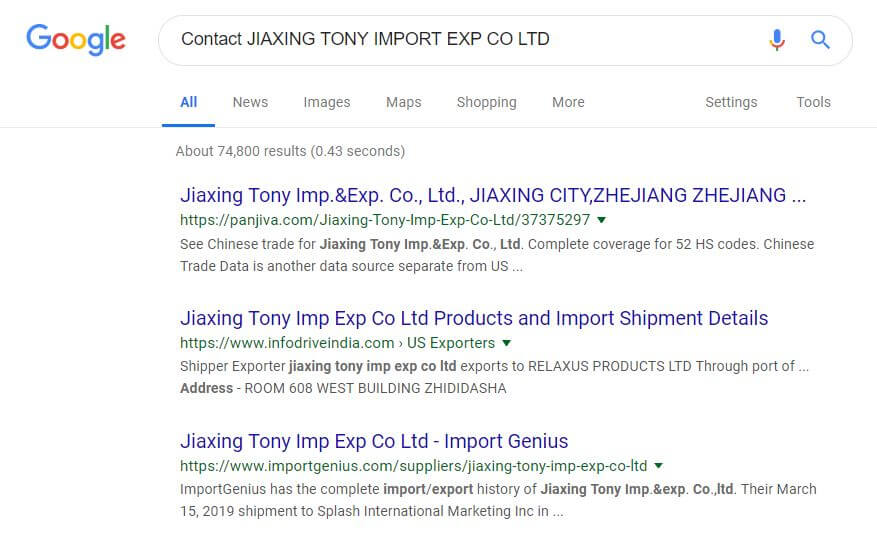 This pulled up Google’s search results and allowed us to find the rest of their contact information without going through a third-party site like Alibaba.