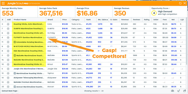 In order to do this right, we needed to know the names of our competitors. The fastest and simplest way to do this was to go to a keyword search results page for ‘marshmallow roasting sticks’, and then opening up the Jungle Scout Chrome Extension.