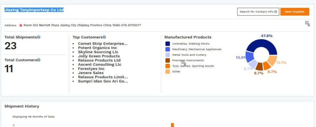 After searching for Sumpri’s suppliers, we were presented with two different manufacturers. And based on the type of products each supplier listed (plastic products vs umbrellas/walking sticks), we scrolled down and clicked on supplier Jiaxing Tonyimportexp Co Ltd.