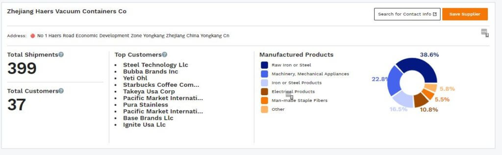 And while the Supplier Database did list Jiaxing Tonyimportexp’s phone number, we wanted to reach out via email. We found that by clicking on the ‘Search for Contact Info’ at the top of the supplier card.