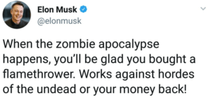 Elon’s got a crazy sense of humor. For example, Tesla’s models are S, 3, and X (get it?). He called his tunneling company The Boring Company. And let’s not forget that he created a lightweight portable flamethrower and made videos of him “playing” with it. If that wasn’t enough, he also put up this twitter post: