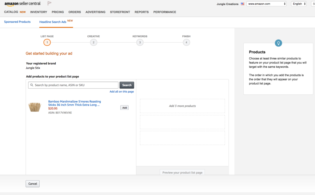 From here, you simply select the three products that you wish to advertise and create the campaigns. At the moment, I only have Jungle Stix in my account here, but for those of you with three or more products, you can simply add them to your campaign.