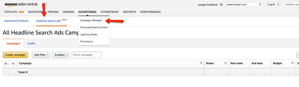 You gotta give Amazon credit for how they make things relatively simple for sellers, most of the time 😉 In order to start your Headline Search campaigns, log in to Seller Central's Campaign Manager (under the Advertising tab), and you will see it, like this: