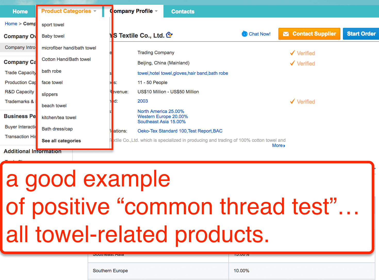 You want to find a supplier that manufactures the product that you are looking for, and a narrow range of related products. For our search for baby hooded towels, that would mean that towels, textiles, robes, etc would be a relevant fit. If you also see iPhone cases, dog leashes, and water bottles, there is a good chance that this is a trading company that acts as a middleman between you and the supplier.