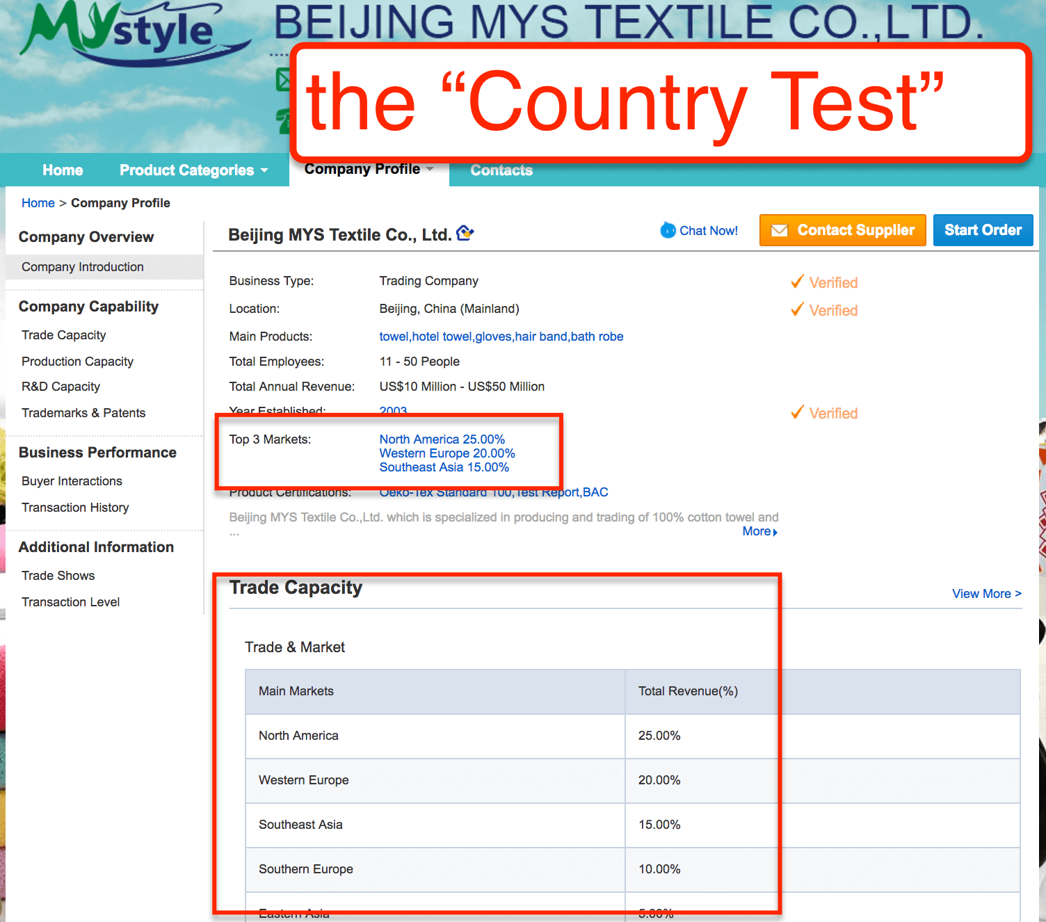 Gary’s “Country Test” asks which countries the supplier exports its products to. The assumption here is that there is a higher quality standard in Europe and North America, and therefore you can expect a higher quality of product from suppliers that export to these regions. If a supplier exports to developing regioins, there may be a poorer product quality.