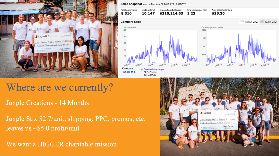 We started selling Jungle Stix about 14 months ago, there has been over $210k in sales, and we have donated about $53k to Doctors Without Borders thus far.