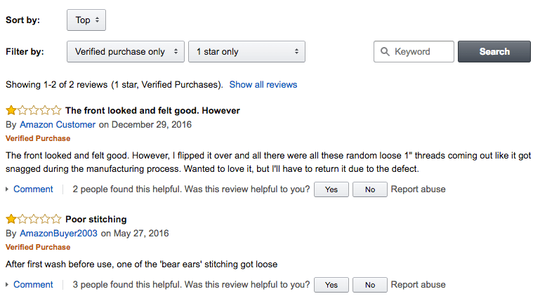 If we were to go forward with this, how would we position our product? To answer this, it is helpful to sift through some of the customer reviews that were critical of the products, to learn where product improvements could be made. Here are a few examples for various baby hooded towels: