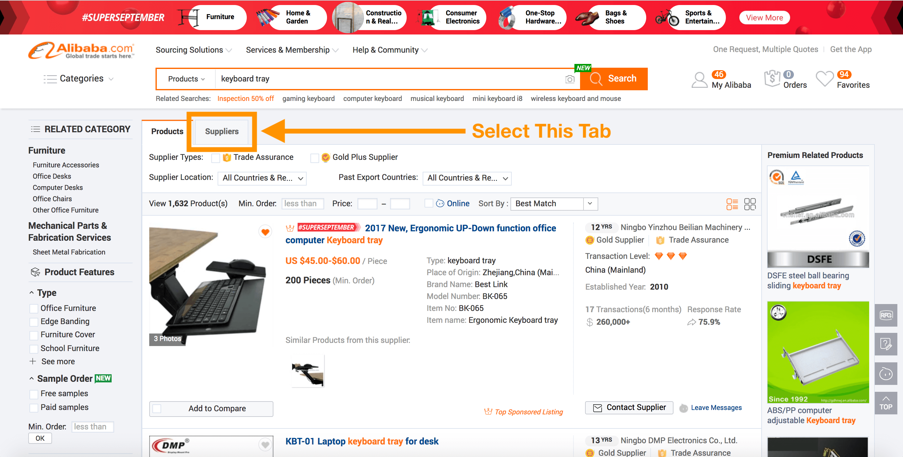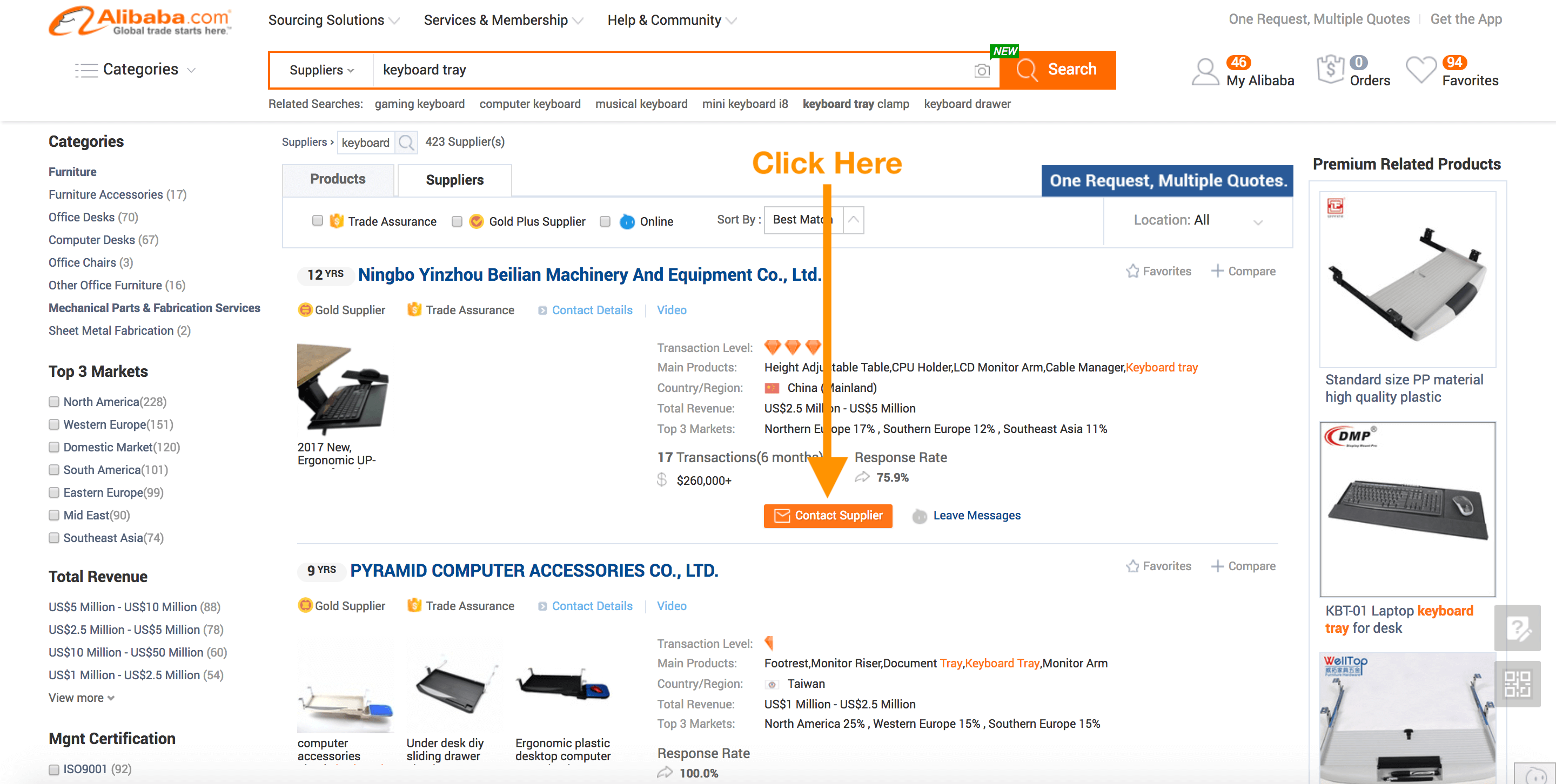 The first thing I’m going to do is head on over to Alibaba.com, and I’m going to type in “keyboard tray.”
