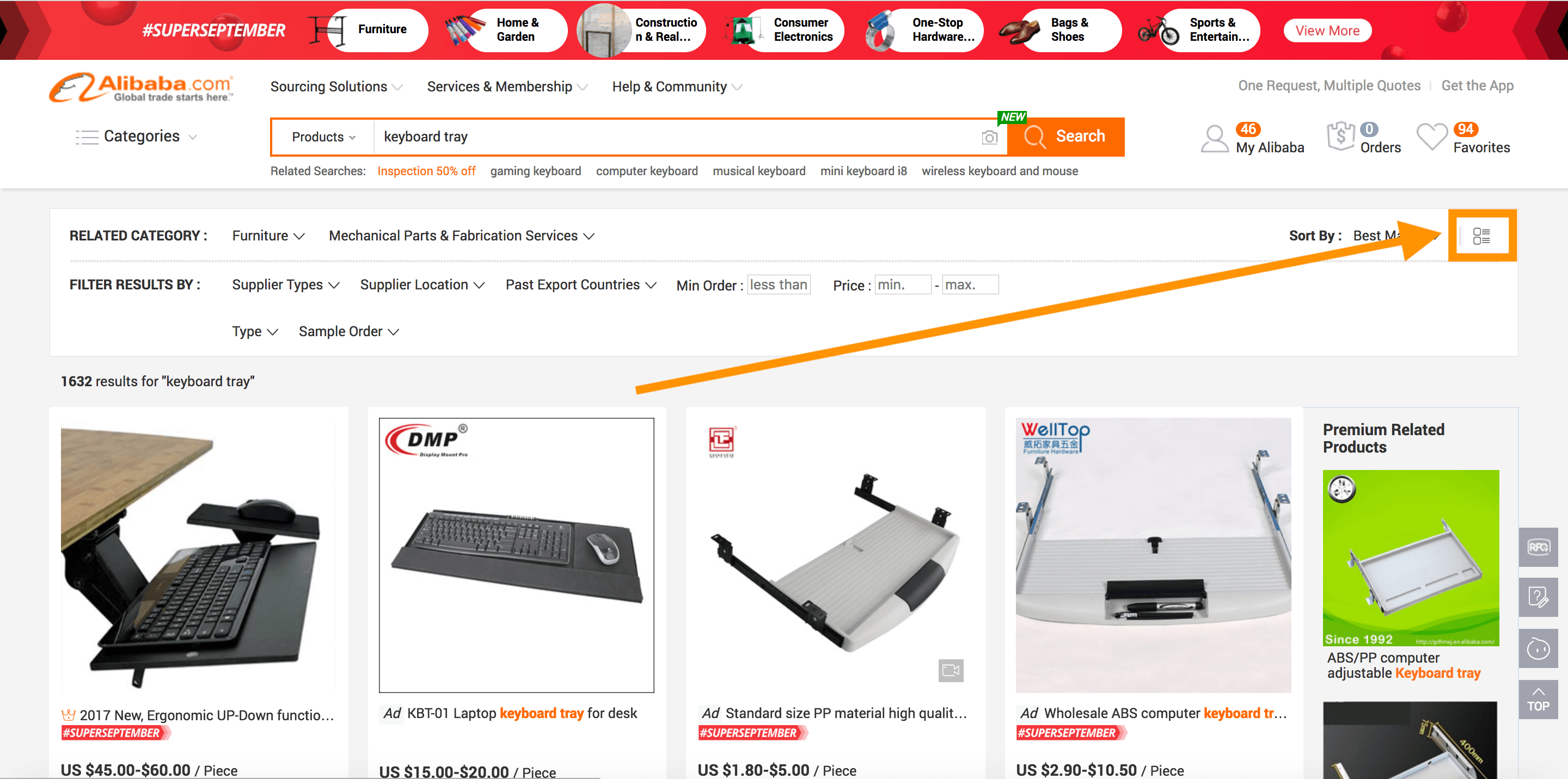 How I like to use Alibaba.com is with a “List View” as opposed to a “Gallery View” (maybe because it more closely resembles Amazon.com with this view). I can change the default view by clicking on the icon in the top right-hand corner as pictured below.