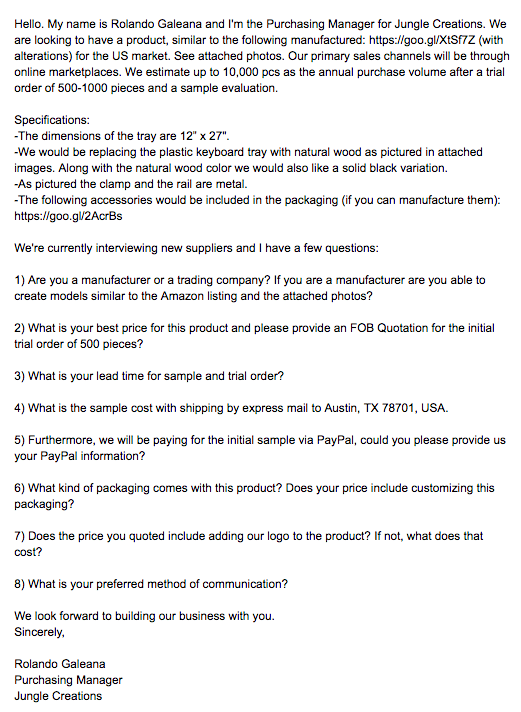 Next, I send a ton of messages to suppliers. What most Amazon sellers find is that a number of these factories will not even respond to you. Between 50% to 70% of the suppliers I message will respond, which is fine, because this just means the most communicative, willing suppliers are surfacing.