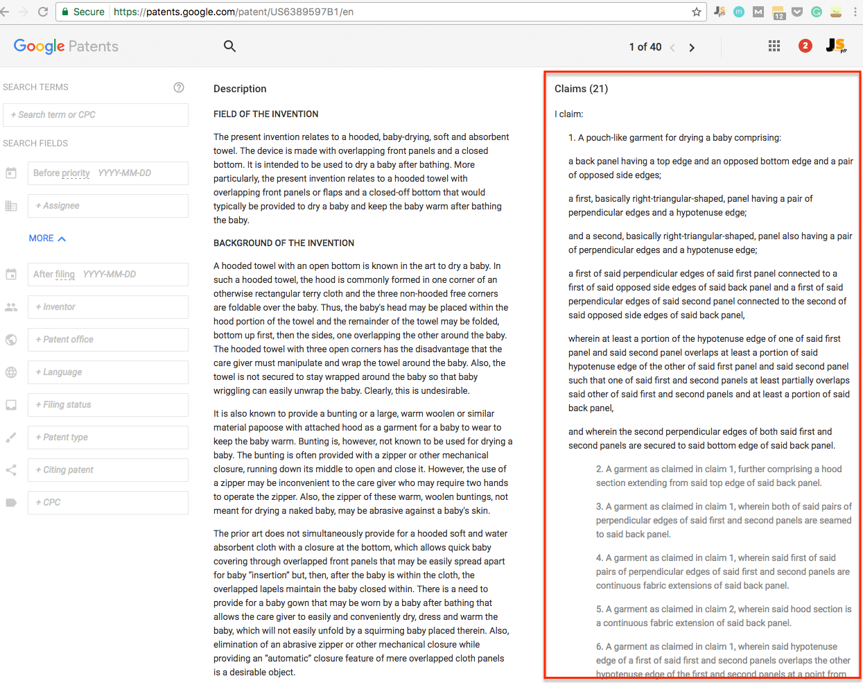 For example, here are the claims of a patent for a “baby hooded towel” found on Google Patents search: