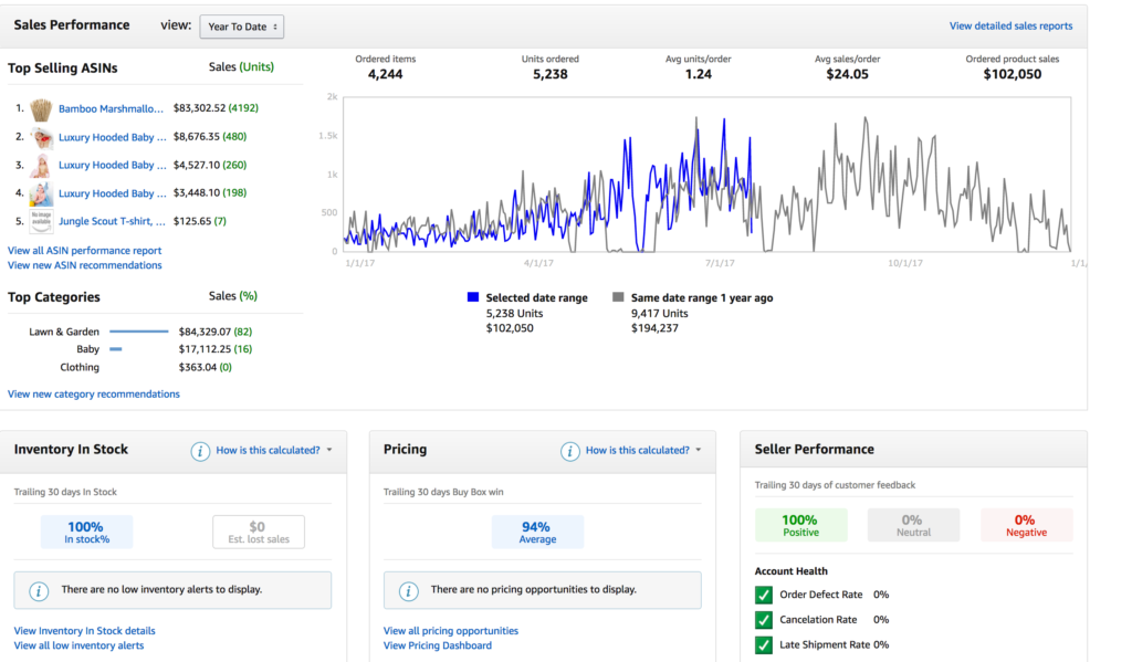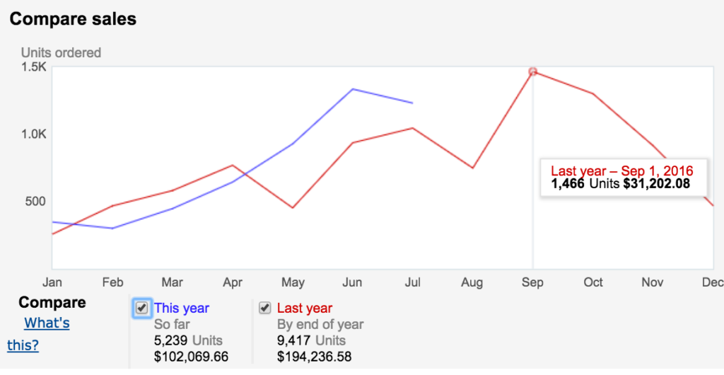There isn’t really a great way to compare time periods in Seller Central. However, in this screenshot, you can see that this year we are outpacing our sales from last year, in the same time period.