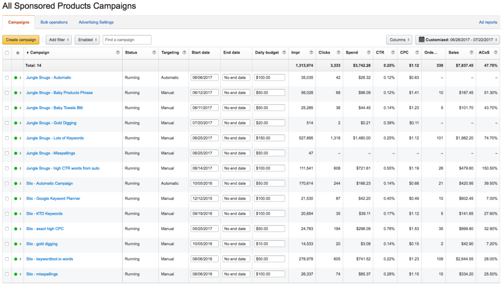 We still need to adjust our bids for the Jungle Snugs campaigns in order to decrease the ACoS, however, that is a process that can take months to really fine tune. Our target ACoS is similar to the Jungle Stix campaigns at <35%. We will continue to work on these campaigns to ensure we have continued traffic and sales, and improved ROI over time.
