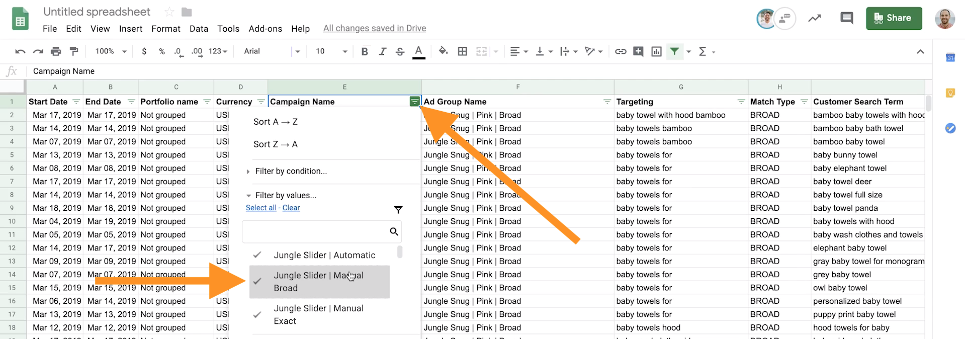 Inside this particular spreadsheet, I have all the data from all of my campaigns. But I just want to optimize my Jungle Slider campaigns, so I have to remove the ones not set up for the Slider’s automatic campaign.