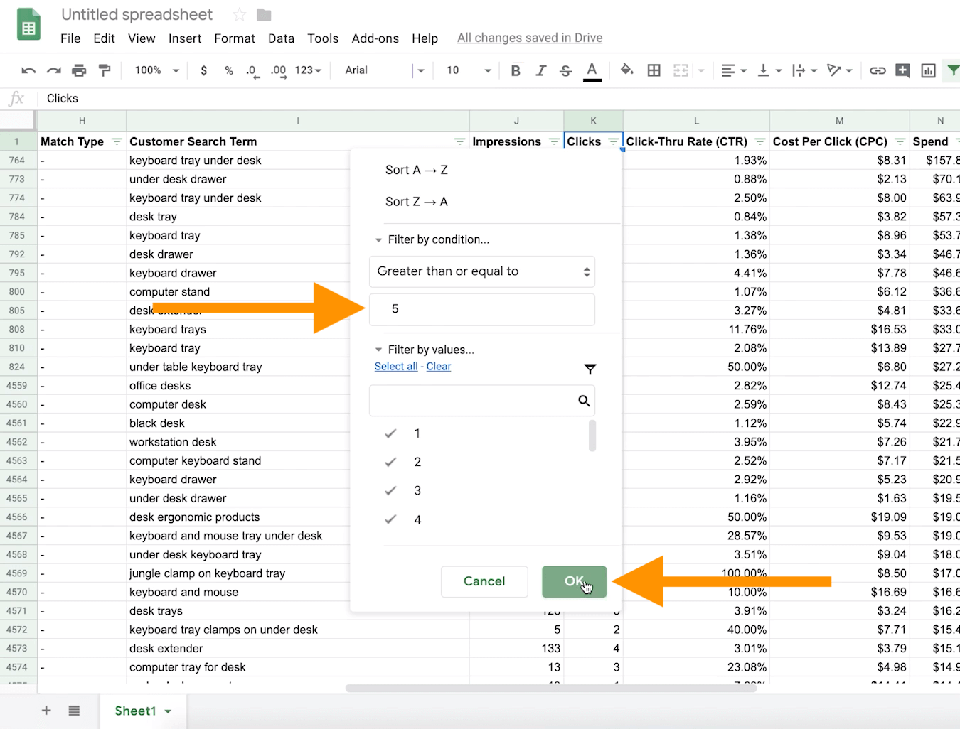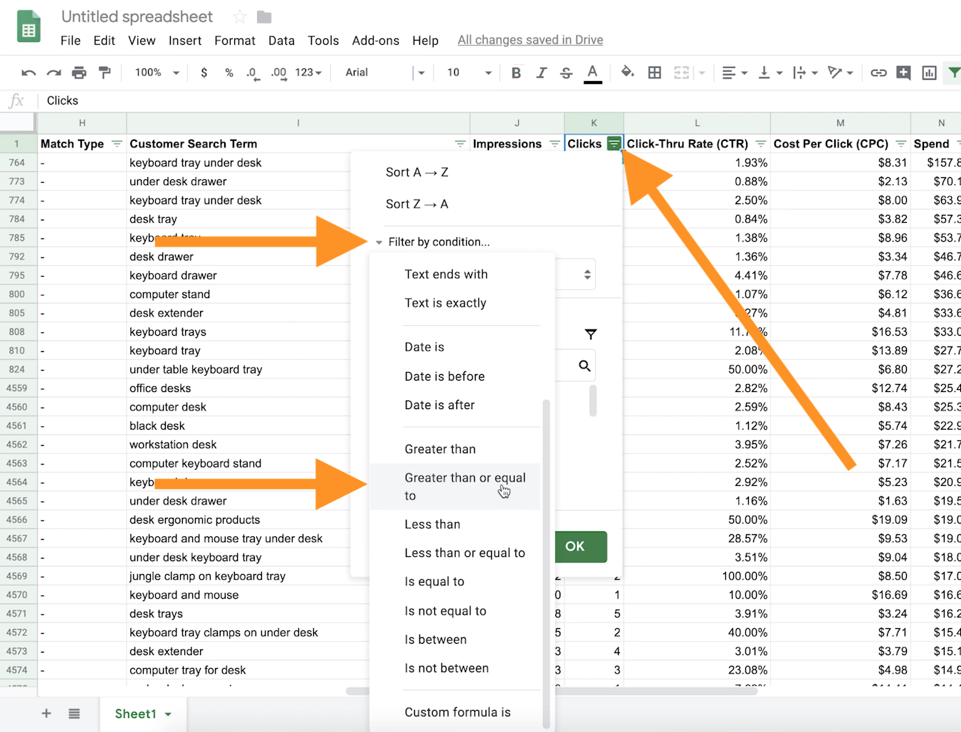 For my first filter, I only want to see keywords with at least five clicks. To get that data, I need to go into the Google Sheet and select the column filter icon next to the title Clicks. From there I need to select Filter by condition, and then Greater than or equal to.