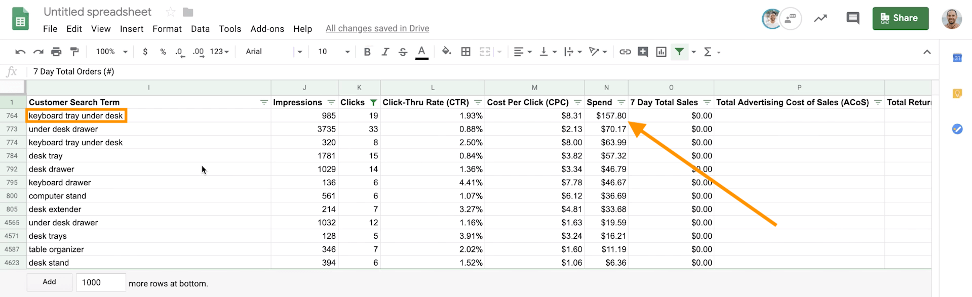 Once it’s filtered, I can see that there are quite a few keywords I’ve spent a lot of money on and that aren’t converting. For ‘keyboard tray under desk‘, I’ve actually spent $157.80 on and have made zero sales.