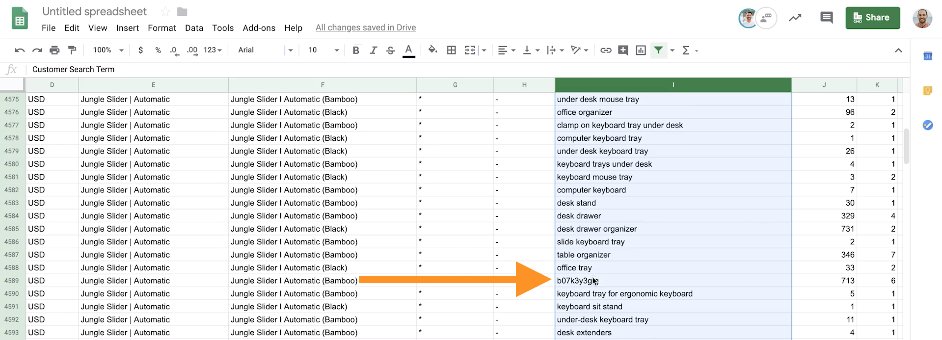 But when I looked through the customers’ search terms, I can see there are ASINs (the alphanumeric strings highlighted below) included in the results.