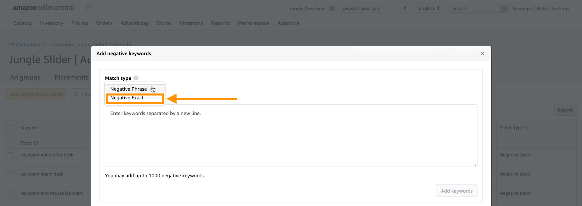 Click the Add negative keywords button. For our campaign, I’m going to choose the negative exact match type.