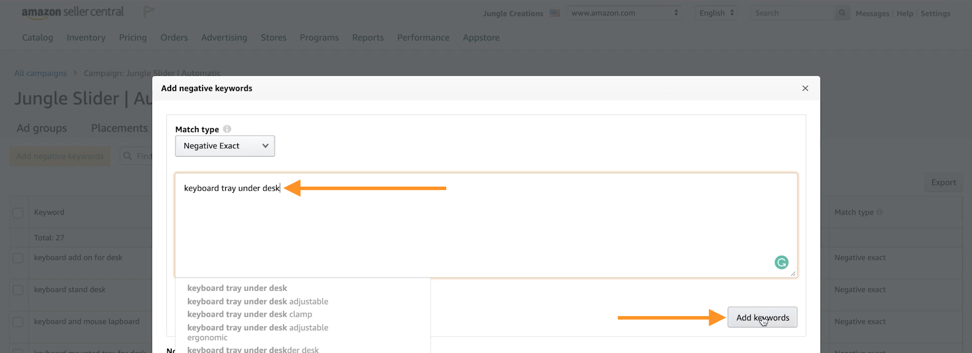 I should add ‘keyboard tray under desk’ to my negative search terms list so that Amazon knows not to show my listing for this particular phrase.