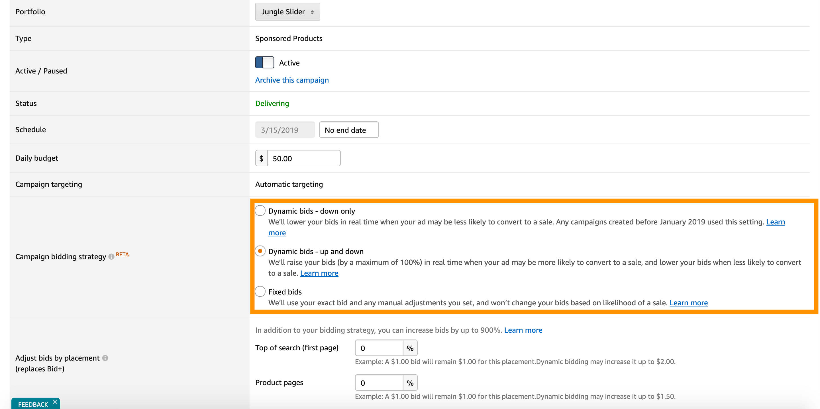 Right now, I have our campaign set to Dynamic bids – up and down, and the maximum amount Amazon will increase our bid (up or down) is 100%.