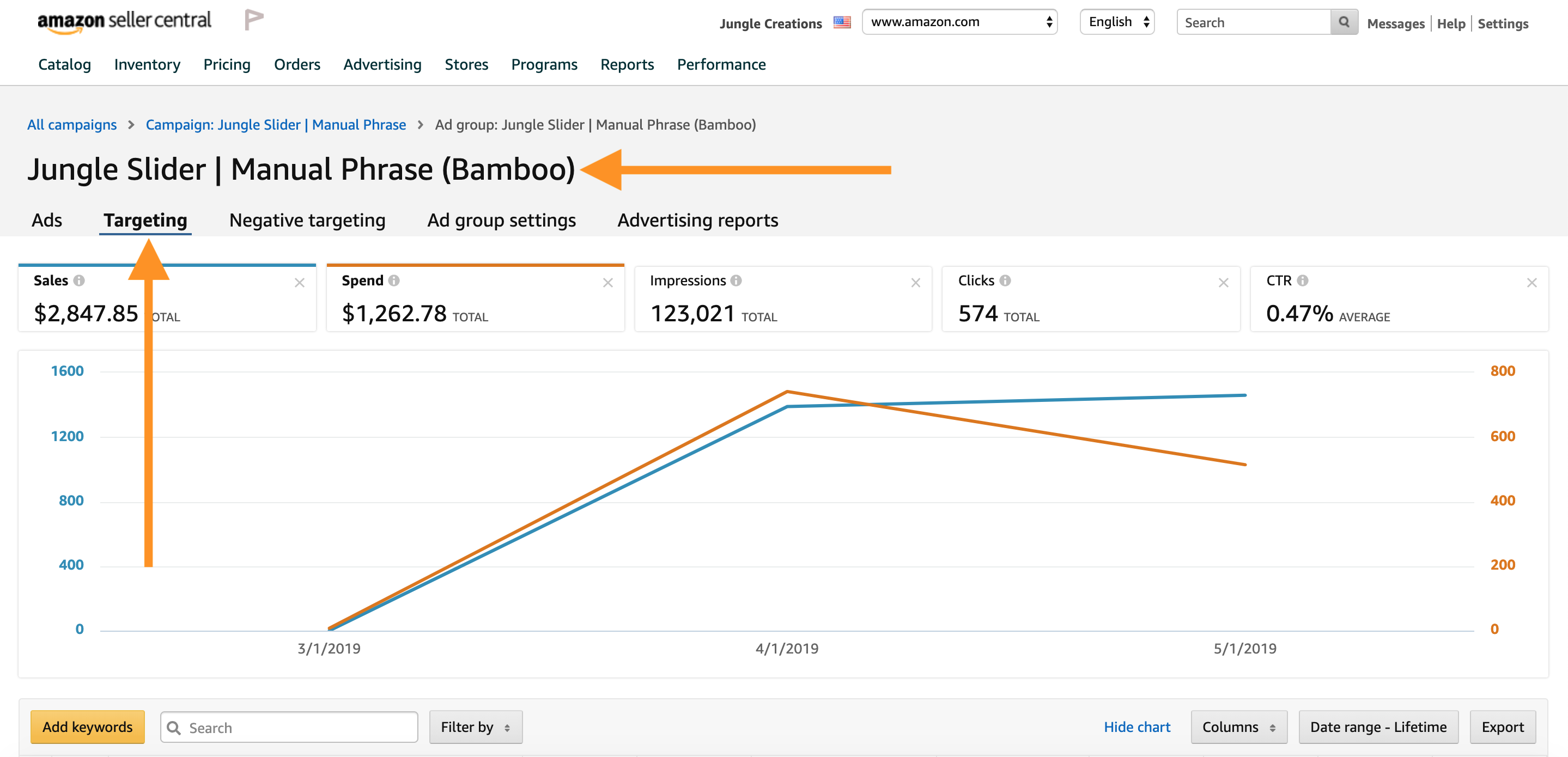 First, I need to click on my bamboo Jungle Slider variant. And to see what keywords I’m targeting, I must click on the ‘Targeting’ tab.