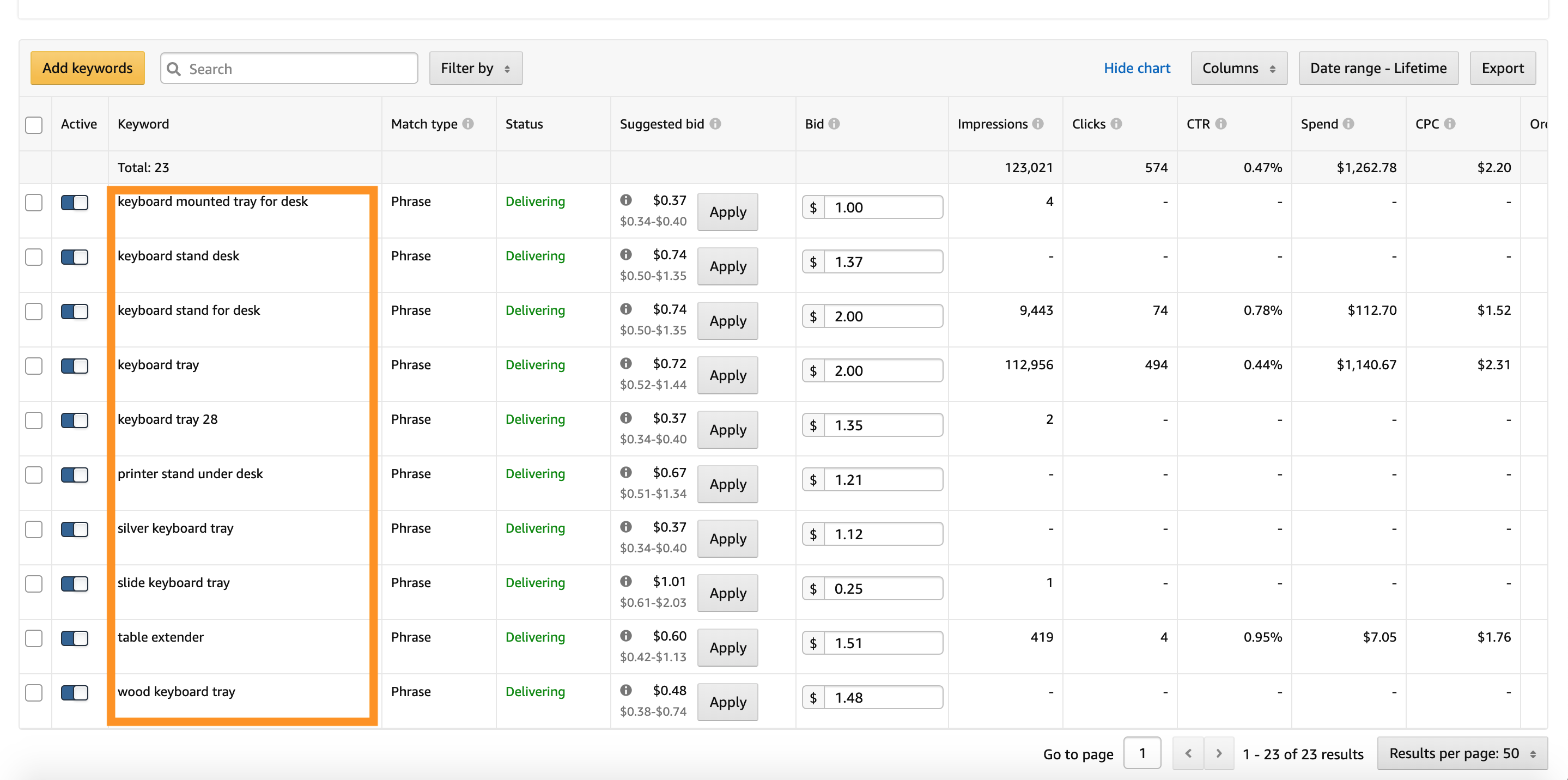 It’s usually pretty manageable to sort by overall spend when you’re first getting started and you haven’t had that many sales. Simply look at each keyword at the top of that list.