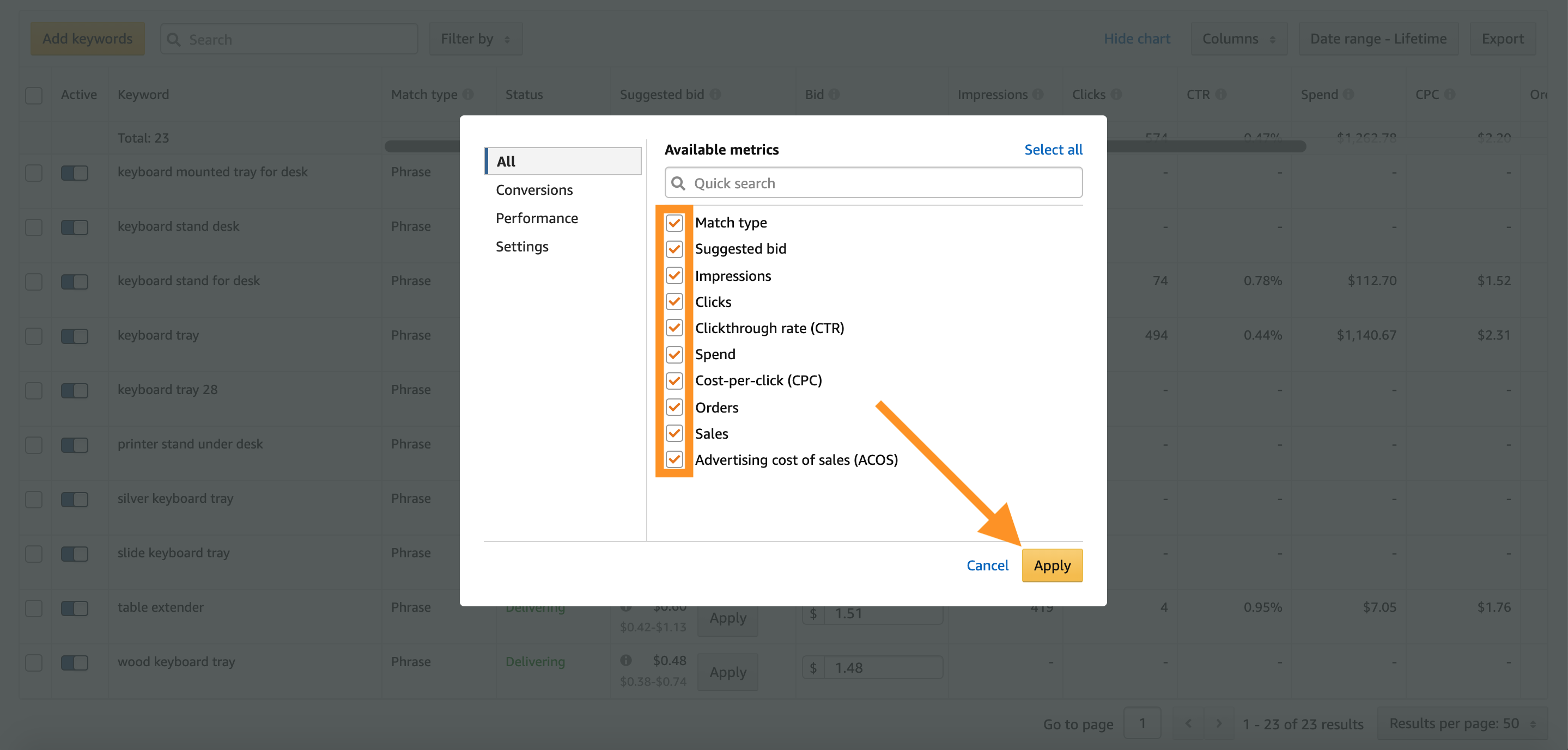 Lastly, I like to make sure that all the different columns are turned on. That way I can see all of the information necessary to make informed decisions regarding my campaign and what I need to optimize it.