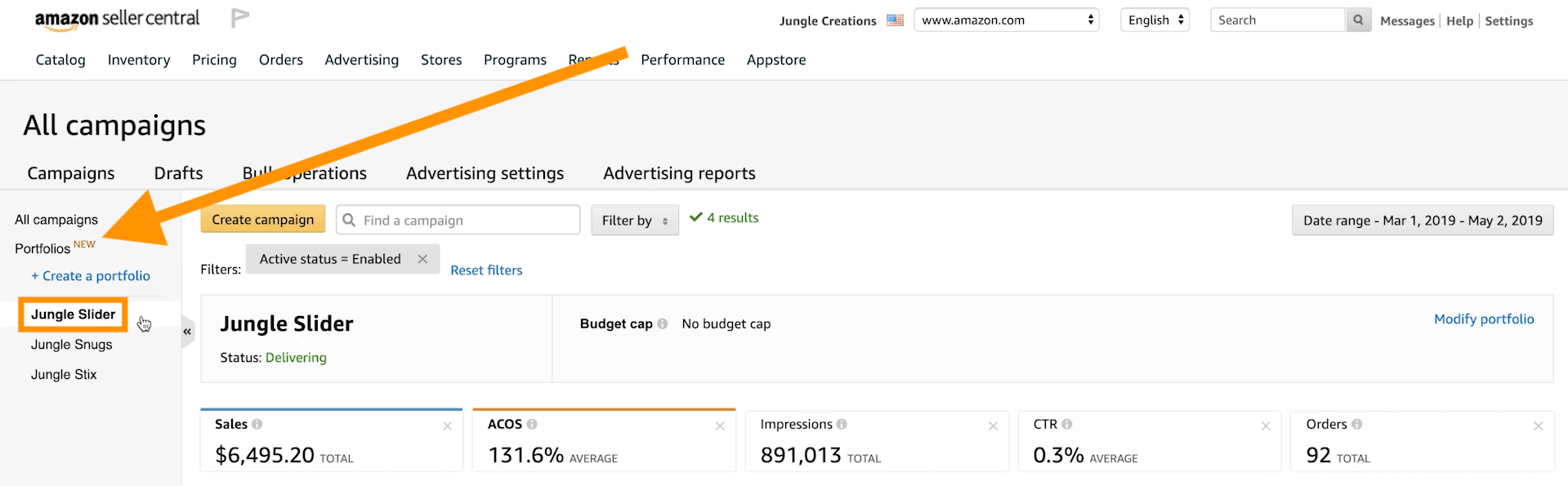 Once you go to the campaign manager section of Seller Central, you’ll notice there’s a new feature to help you organize your campaigns. Amazon now allows you to split up your PPC campaigns into what they call Portfolios.
