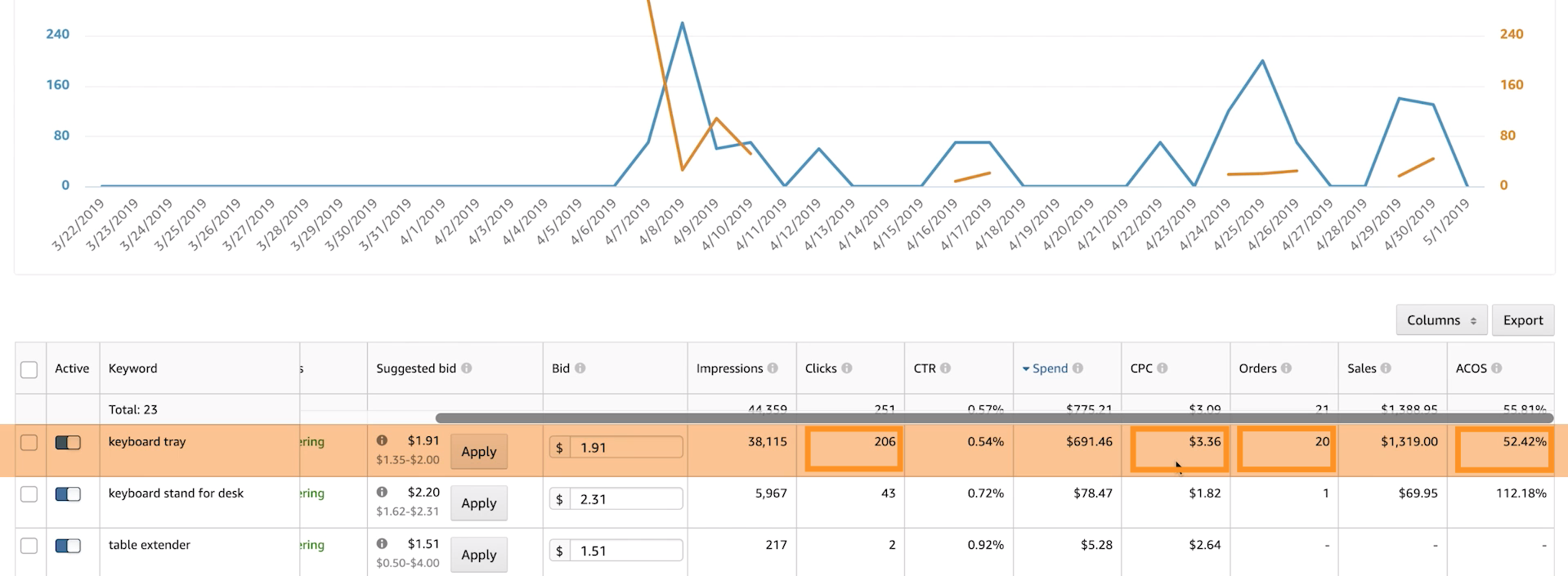 For my top keyword–keyboard tray–I’ve had 206 clicks. My cost per click is $3.36, and I’ve gotten 20 sales. That means my ACoS is 52.42%. But let’s round that down to 50% for ease of computation!