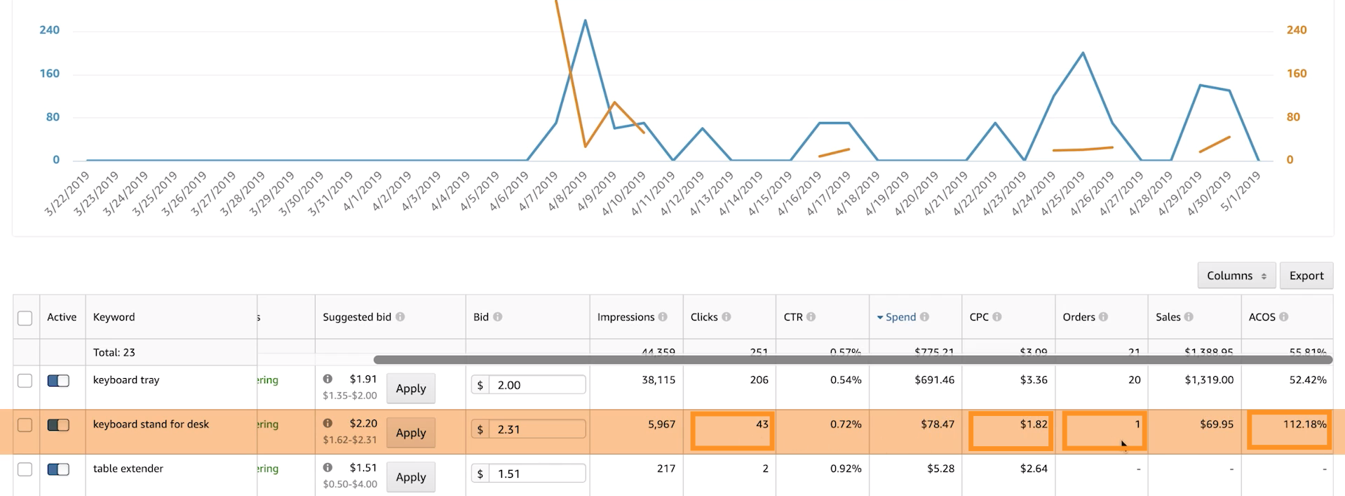 Since this listing’s still fairly young, however, and I’m still trying to get as many sales as I can, I’m willing to spend up to about 100% ACoS. In other words, ‘keyboard tray’ is performing well, as it’s approximately 48% below my max ACoS of 100%.
