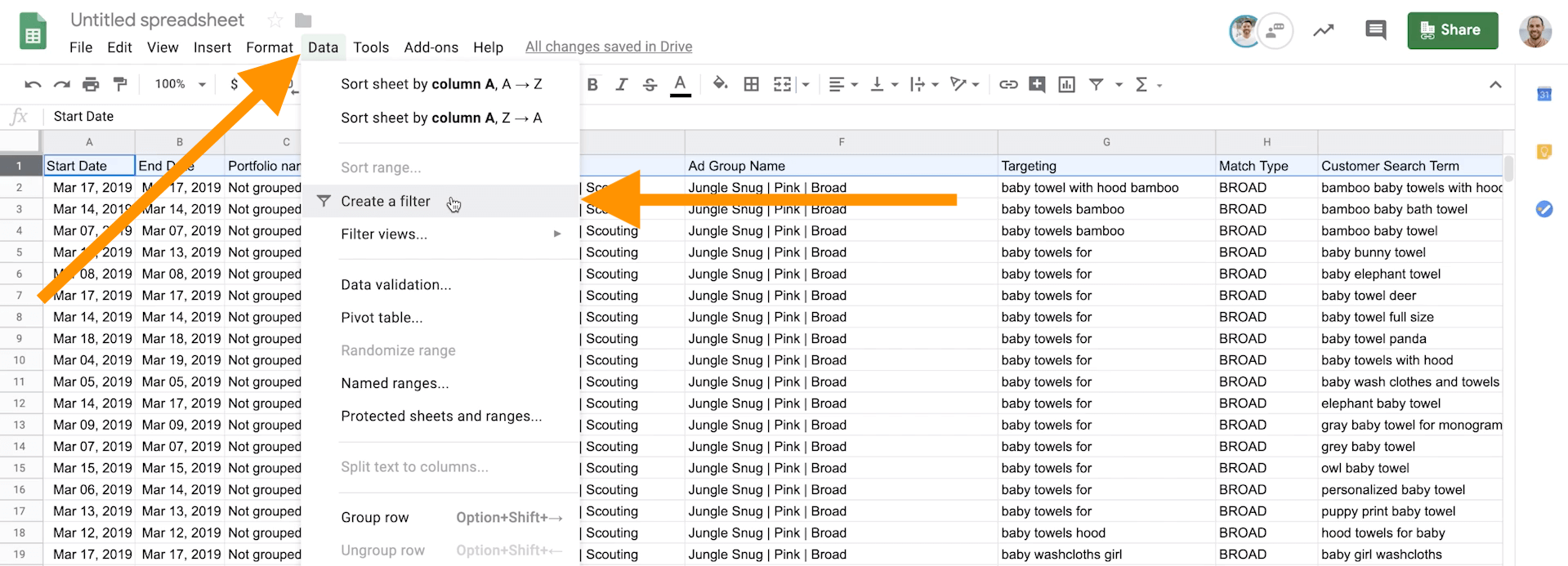 So let’s go into our Search Term Report to find some poorly performing keywords that we can add to our negative keyword list. In order to do this though, I’m going to have to add some filters.