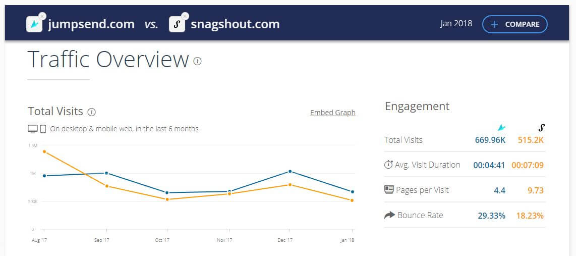 Jumpsend is, by far, the web’s best promotional giveaway site. For starters, Jump Send does 23% more traffic than its next biggest competitor, Snagshout. Take a look at the SimilarWeb graph below for proof: