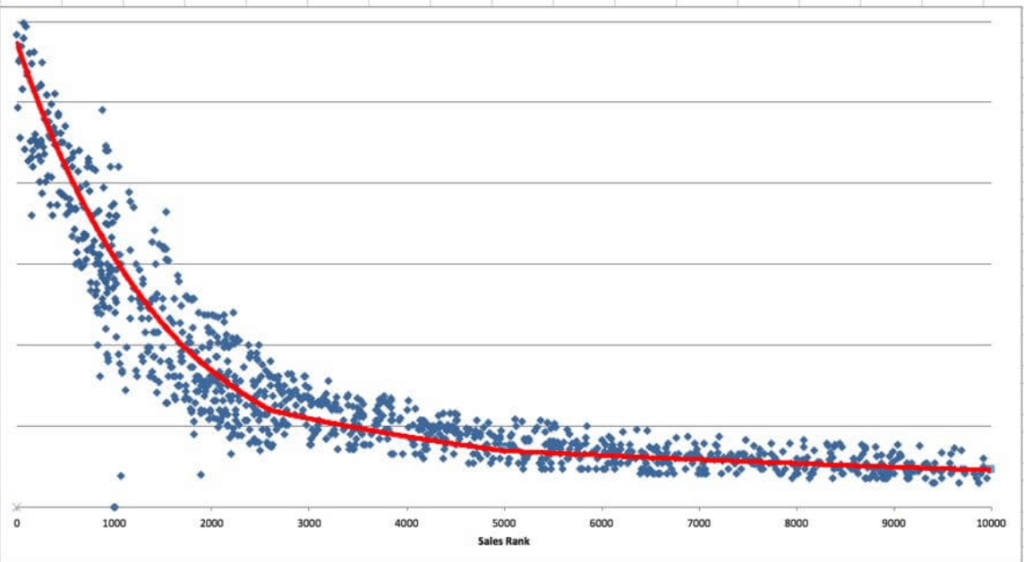 So on the X-axis is the Best Seller Rank. And on the Y-axis is the unit sales, per month. When you look at graphs like this, you can see that BSR is directly correlated to unit sales, as indicated by the red line, which is the “line of best fit.”