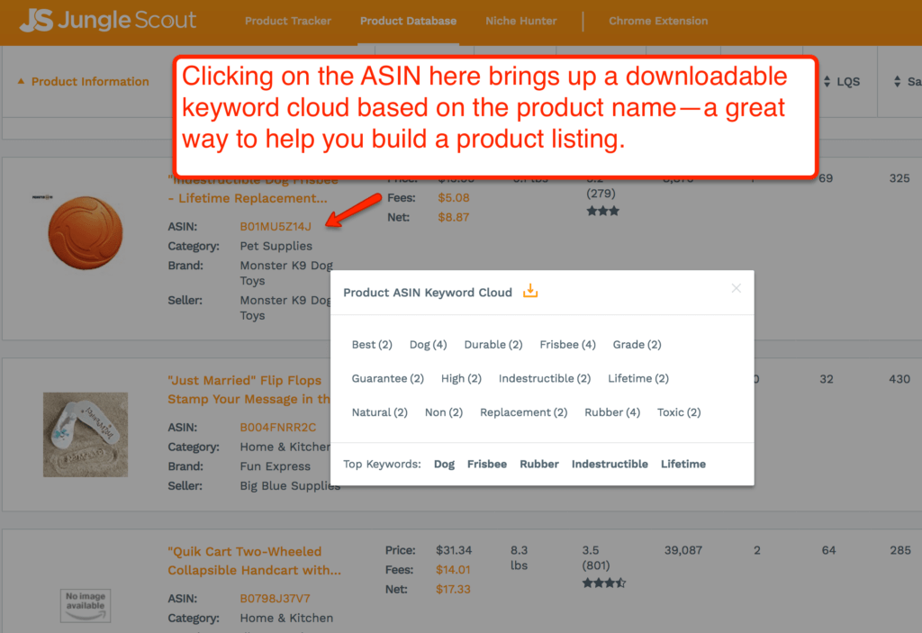 Not everyone has that luxury, especially if the product is not actually live yet. So we have the optimal solution for you: Keyword Clouds. In the Product Database, if you click on the ASIN, you can pull up the Keyword Cloud, which looks like this: