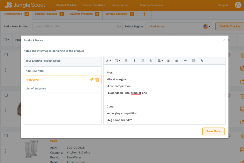 We have just built an easy way to create a unified log of notes on any product that you are tracking. Meet Product Notes, inside the Product Tracker. This is where you can add new notes in your Product Tracker: