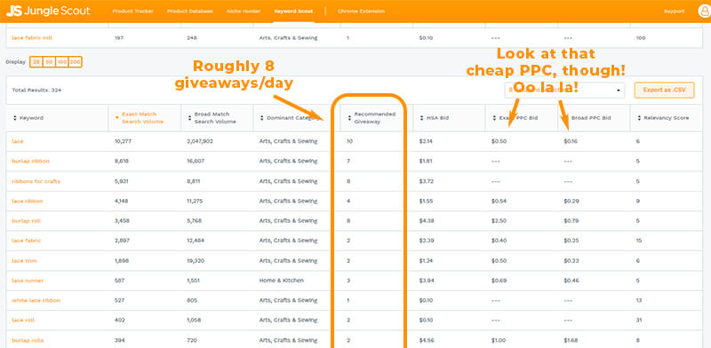 We’re probably not going to see a whole lot of sales to start. I’m guessing around 100 per month if we’re good with our PPC and promotional campaigns. Keyword Scout says that most of the best keywords tied to “lace fabric roll” need 5-8 giveaways per day.