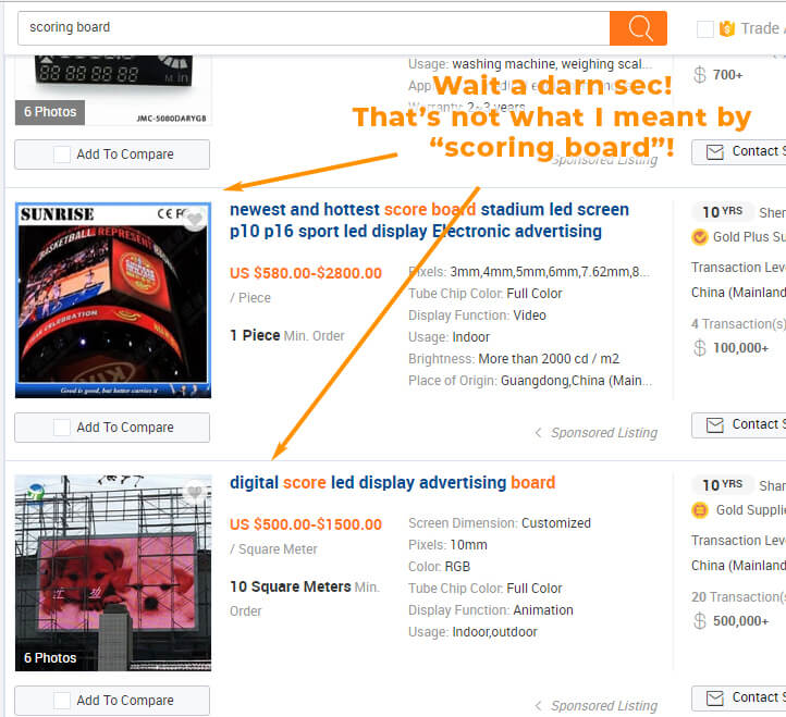 Right away we can see an issue here. That’s not what we meant! And sometimes that happens with Alibaba. So we’re going to need to find a different way to search. So instead, I went through Google and did a search for “scoring board Alibaba” hoping that Google’s search engine worked a little better than Alibaba’s.