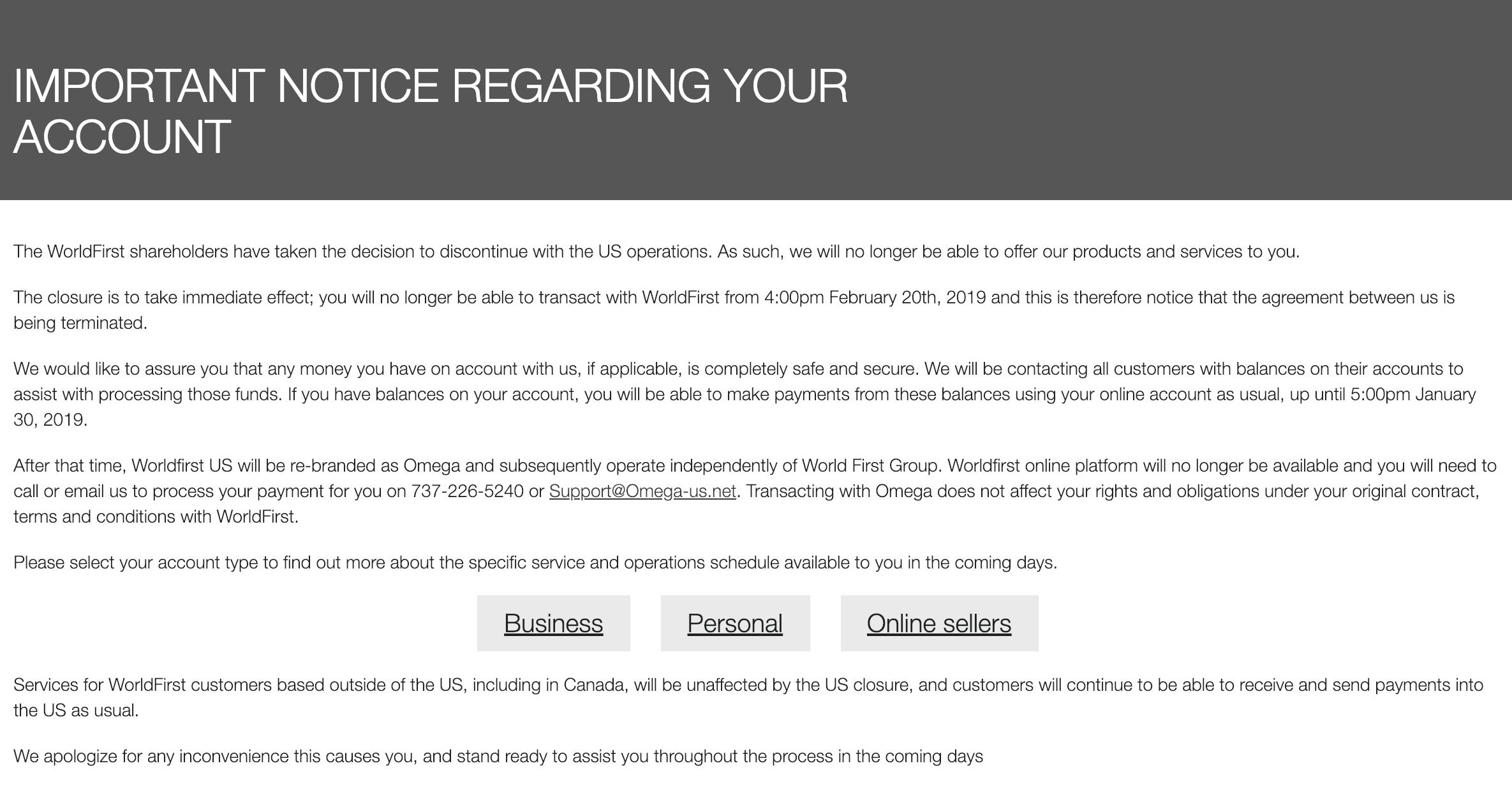 If you are a WorldFirst US user, contact Omega Support for any and all help you might need. And your open transfers to existing beneficiaries are available until February 7th.